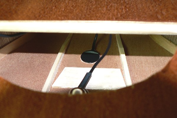 The Big Island Spot is an internal single-head pickup for fan-braced ukuleles. It is designed with the player in mind who seeks a quicker and easier mount than our Aloha Twin pickup system. The second photo shows an installation on a basic fan-braced instrument. For ukuleles with X bracing we recommend our Aloha Twin, which is well suited for both bracing types. The Big Island Spot has a strong output signal even without a preamp.
